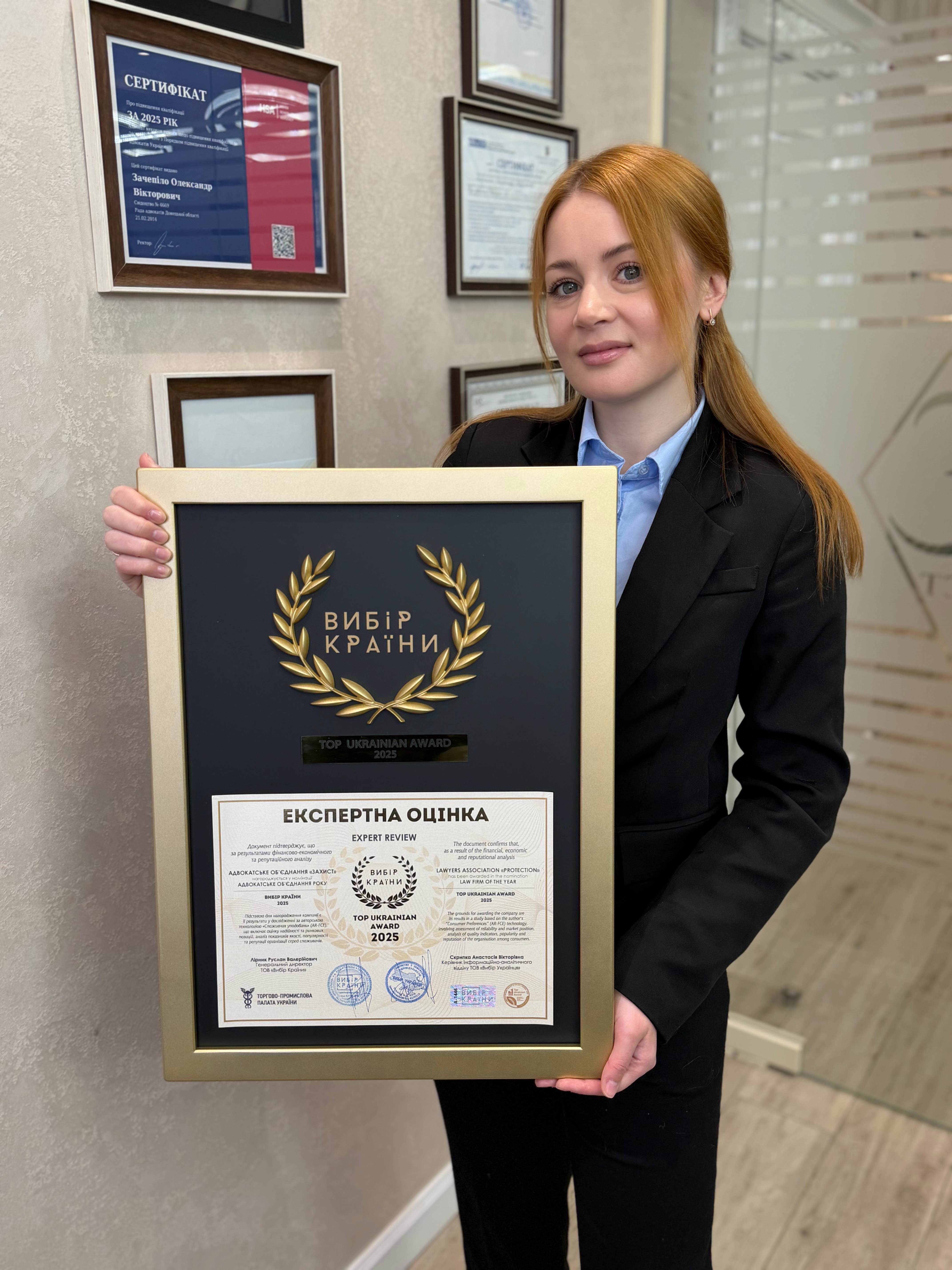 Ця нагорода свідчить про те, що Адвокатське обʼєднання «Захист» формує високі стандарти надання юридичних послуг і надалі ми будемо тільки піднімати цю планку. Всім клієнтам дуже вдячні за довіру! Адвокатське об’єднання «Захист» - вибір Країни 2025